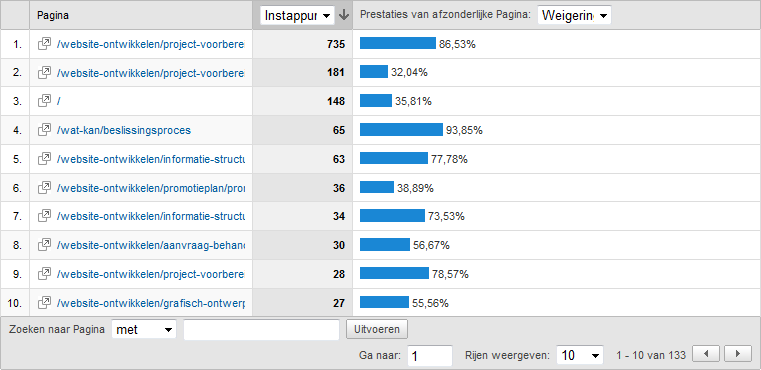 Tabel met belangrijkste bestemmingspagina’s van webbl.nl in Google Analytics